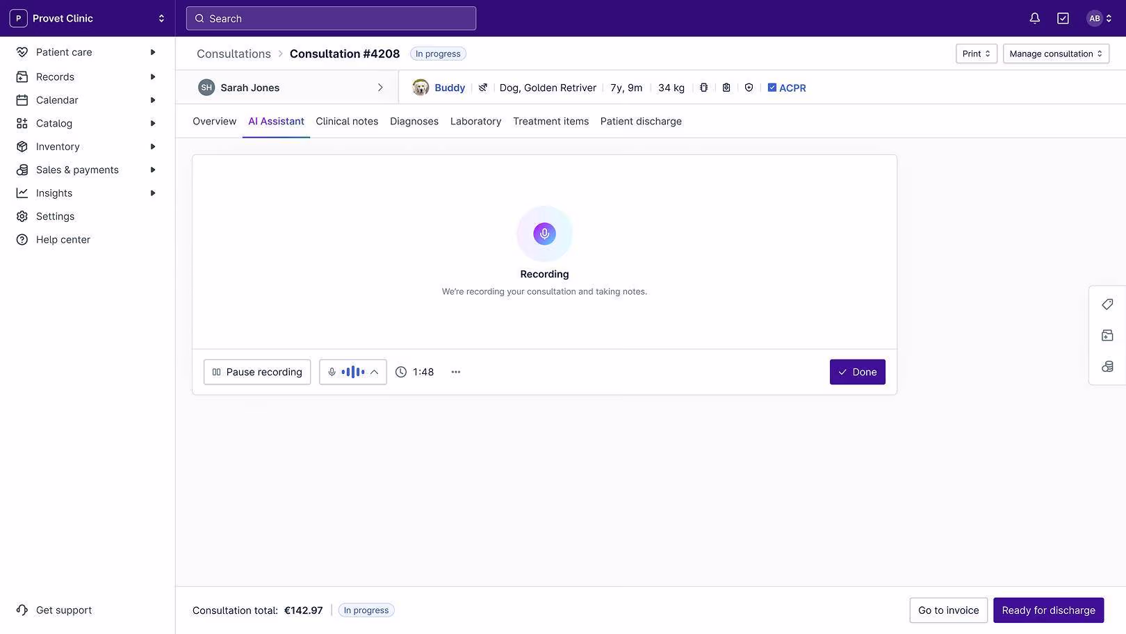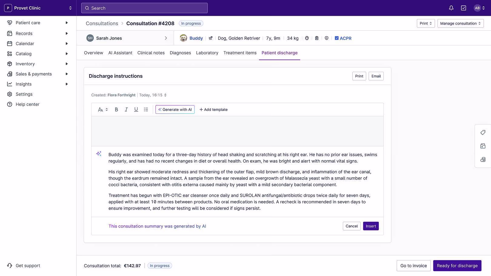 AI discharge wraps up the consultation with ready-to-send instructions.